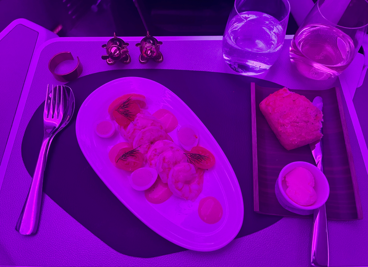 We started our babymoon in London, and I was able to find a business class award booking on the Air France/KLM website flying on Virgin Atlantic metal from SFO-LHR (San Francisco to London Heathrow). The ticket cost 114,000 miles each and we transferred Chase points to Air France for the flight. There was a transfer bonus happening at the time we transferred the flight, so our points were worth 25% more than usual. It was our first time flying on Virgin Atlantic Upper Class, and we were excited for the trip. The Virgin Atlantic lounge at SFO was small but stylish. The food and drinks were pretty good, and you could order items directly from your seat in the lounge using a QR code on each table. The flight itself was comfortable and we were able to stay up for most of it to try and get our bodies used to London time.